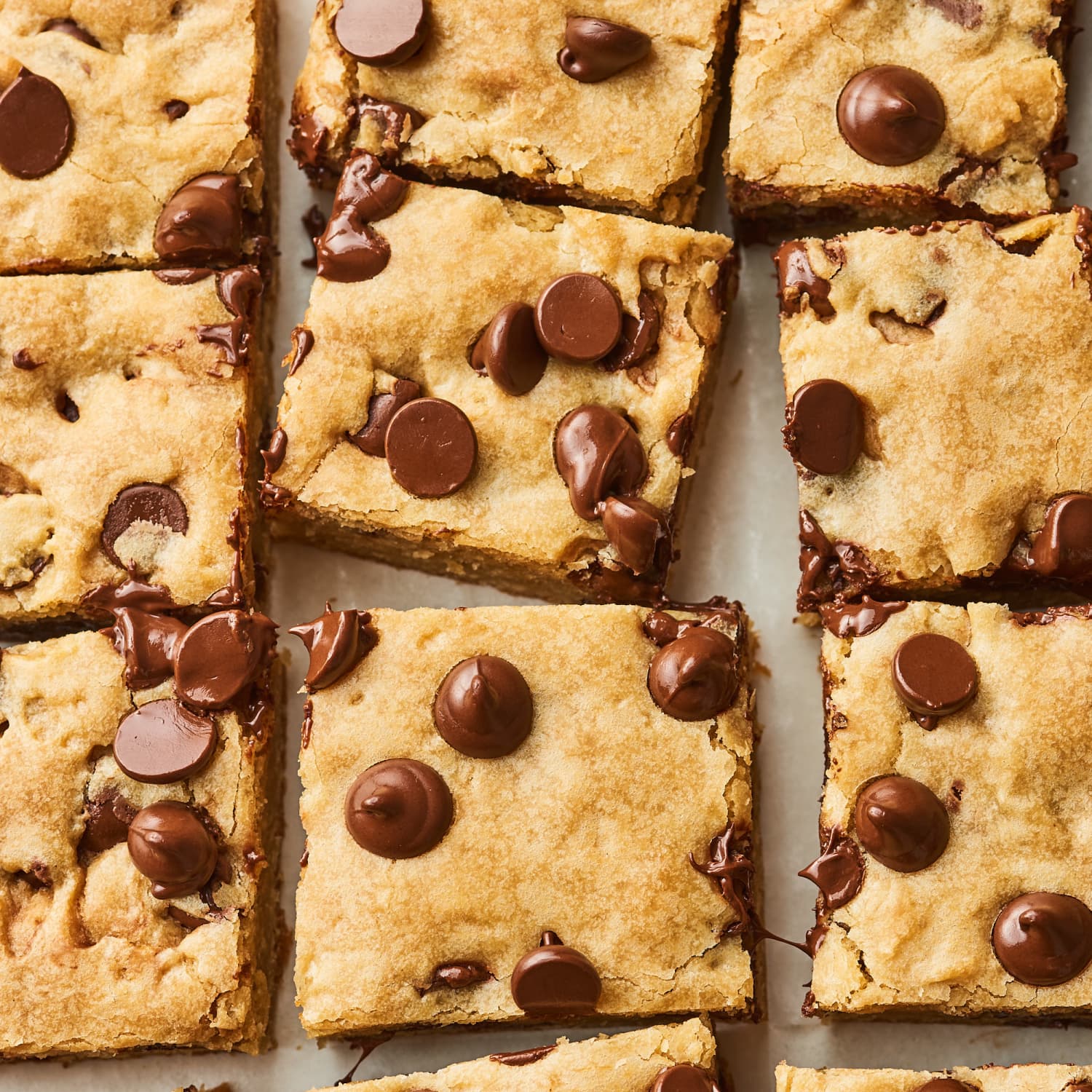 - Cool the blondies before cutting. Cool completely in the pan on a wire rack. Grasp the excess parchment and lift the blondie slab out of the pan and onto a cutting board. Cut into 16 squares.