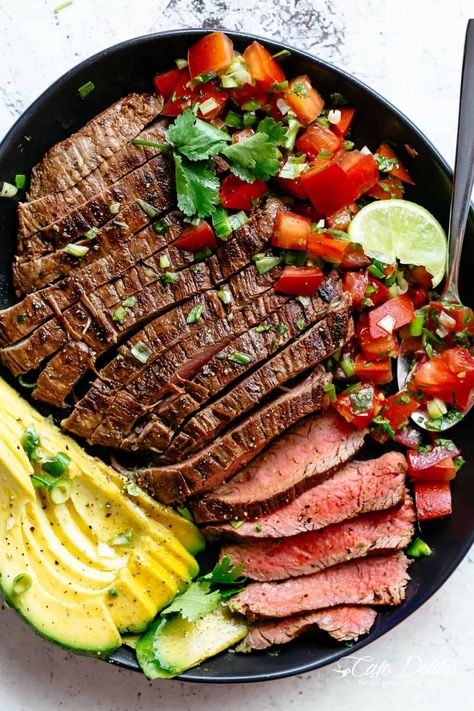 • Add the steak to a glass or non-reactive baking tray and pour the marinade on top. Ensure both side of the steak are well coated, cover the baking tray with plastic wrap and marinate for 1 to 4 hours. Alternatively, you could marinate in a plastic bag.