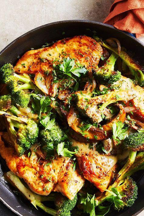 5. Return the chicken to the pan and spoon the mushroom mixture on top. Arrange the broccoli around the chicken. Top with cheese. Broil until the cheese is golden brown, 1 to 2 minutes. Serve topped with parsley and/or more thyme, if desired.