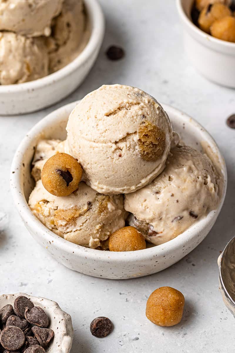- Take the pan of the cookie dough bites from the freezer and add ⅓ of the cookie dough bites and pulse for 30 seconds to break them up.Stir in the remaining cookie dough bites, reserving some for topping on the ice cream. Serve immediately for a soft-serve consistency, or transfer to a resealable airtight container or a loaf pan and freeze until solid, approximately 2 hours. Serve with reserved cookie dough bites and enjoy.