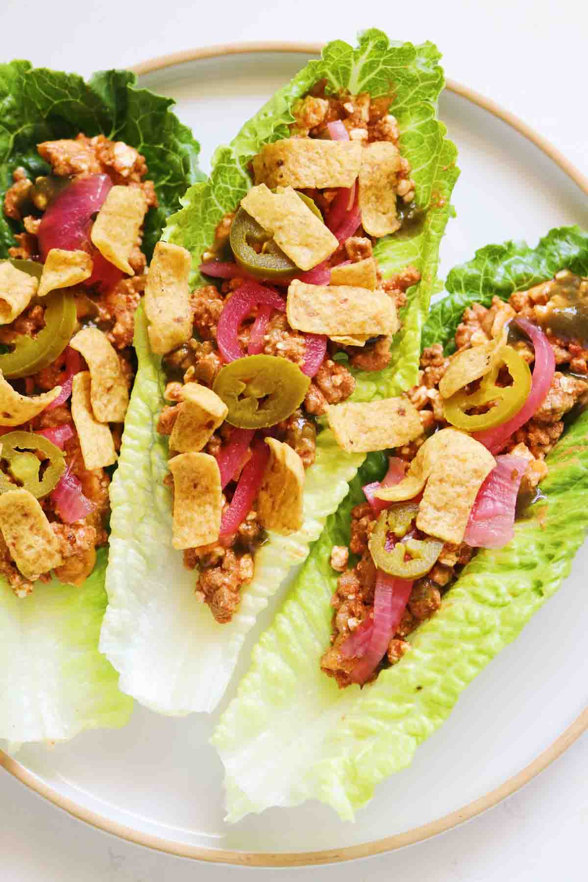 • Add a few scoops of the cottage cheese walking taco mixture to each lettuce leaf then top with your favorite hot sauce, pink pickled onions, pickled jalapenos and crushed fritos.