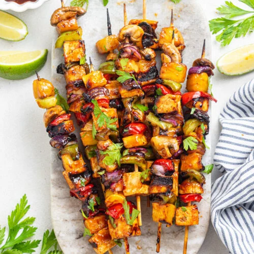 Skewers the pineapple, tofu and veggies onto metal skewers and place the skewers on a baking sheet.