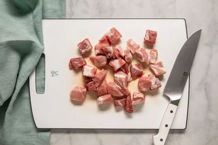 1. Using a sharp knife, slice the pork into 1-inch-long pieces that are 1/2-inch thick. Leave some of the fat on the meat for flavor and tenderness.