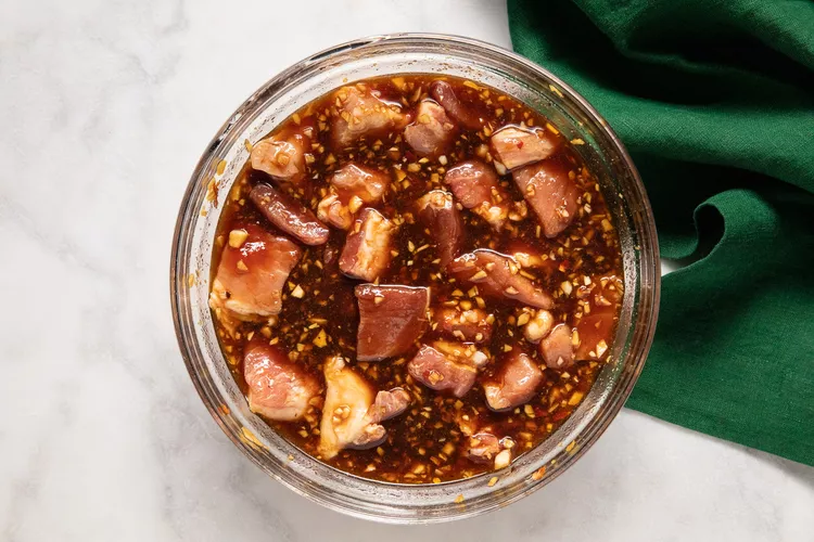 1. In a large bowl, combine the sliced pork pieces with the marinade ingredients: minced garlic, soy sauce, ketchup, soda, calamansi (or lemon) juice, sesame oil, garlic powder, red pepper flakes, salt, and black pepper. Massage the meat, incorporating the marinade well.
