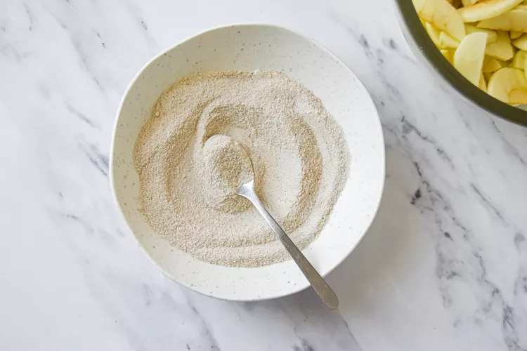 - Combine the sugar, flour and spices (allspice, nutmeg, cinnamon) in a bowl. Add the flour mixture to the apple slices and use your hands to distribute the flour through the apples so they are well coated.