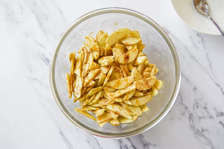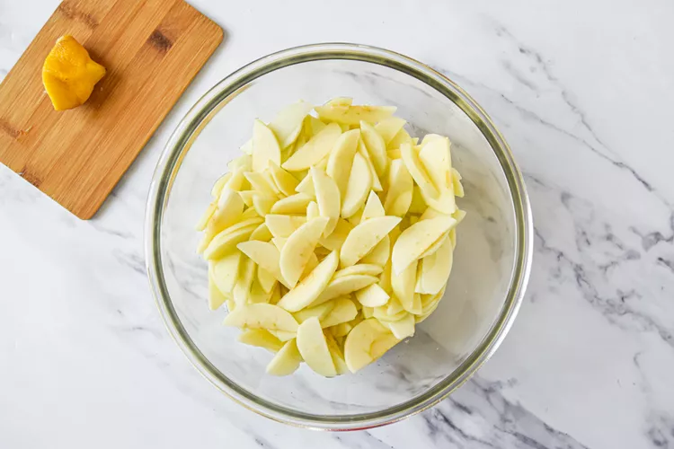 - As you cut your apple slices, add them to a large bowl and toss them with the lemon juice or apple cider vinegar to help keep them from turning brown.