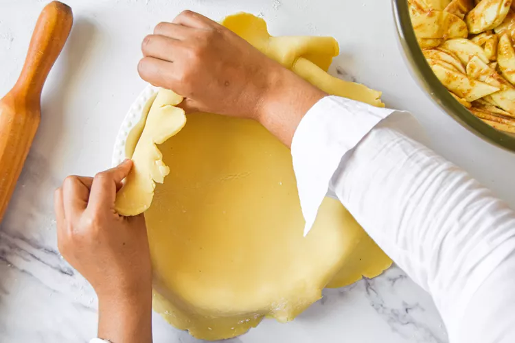 - Roll out the second disk of dough, again to 12-inches. Gently place the second round of pie dough over the apples. Trim excess dough with kitchen shears, leaving a 3/4 inch overhang from the edges of the pie pan.