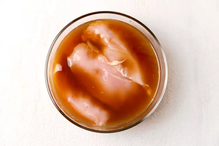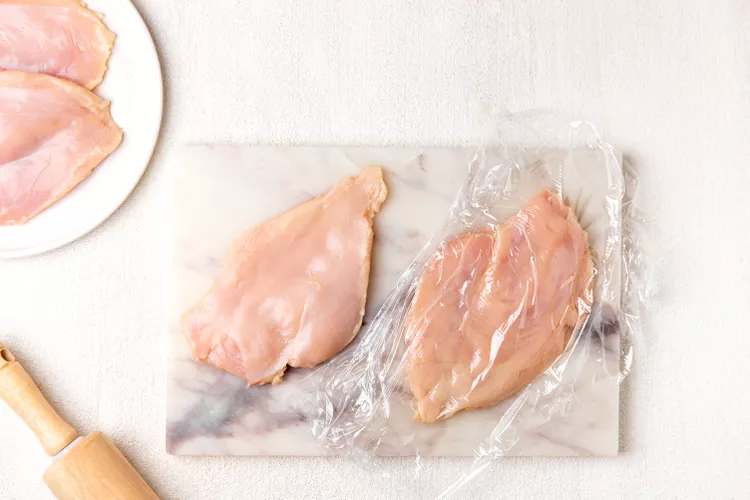 Pound the chicken:Remove the chicken breasts from the marinade and pat them dry with a paper towel. Discard the marinade. Place the chicken breasts on a cutting board and use a meat mallet or rolling pin to pound them to 1/2-inch thickness.