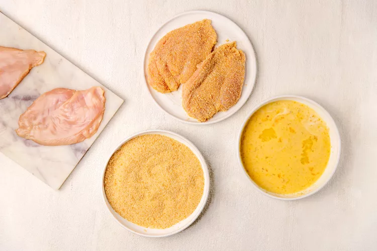 Bread the chicken:In a shallow bowl, whisk together the eggs, heavy cream, salt, onion powder, and white pepper. Pour the breadcrumbs into a separate shallow bowl.Dip a chicken breast in the egg mixture, letting the excess drip off, then coat in the breadcrumbs. Place on a clean plate or baking tray and repeat with the remaining chicken.