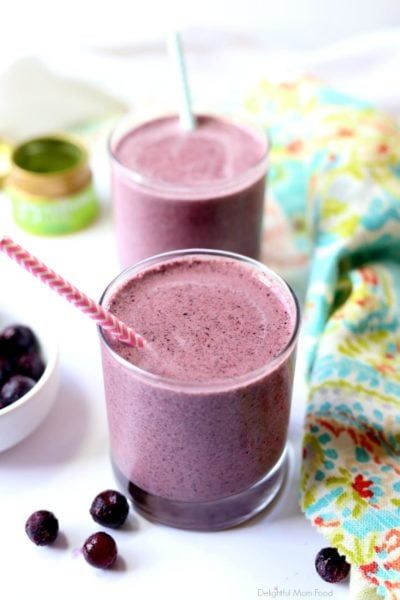- In a blender, blend the nut milk, blueberries, banana, protein powder (if using), matcha, chia seeds, cinnamon, ginger, and salt until smoothie. Pour into two glasses and serve immediately.