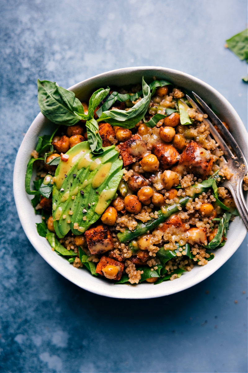 • Thinly slice (ribbon) the baby spinach and add to 4 bowls (add as much/little spinach as you’d like). Microwave quinoa according to package directions and divide it equally among the bowls. Drizzle a touch of dressing into each bowl and give it a quick toss. Divide roasted veggies equally among the bowls. Thinly slice or chop the avocado and add in equal parts to each bowl. Ribbon the fresh basil and add on top (to taste). Drizzle the sauce over each bowl (as much or as little as you’d like—there will likely be extra!) Enjoy!