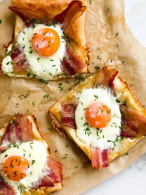 - Lay bacon strips onto puff pastry squares to resemble an X. Using the back of a spoon, push down onto the center of the squares to make a deep indentation. This will help the eggs stay in the center.
