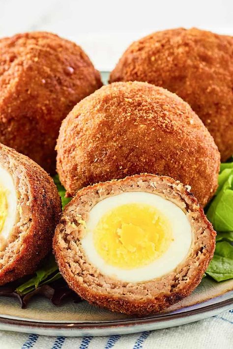 - Fry the Scotch eggs:In a medium pot, add the oil and bring it up to 350°F over medium-high heat.Use a slotted spoon to gently lower 3 Scotch eggs into the hot oil one by one. Fry them for about 8 minutes, until evenly golden brown. If the eggs aren’t completed submerged in the oil, flip them halfway through to ensure even cooking. Transfer them onto a wire rack set over a baking sheet to drain. Fry the remaining batch.Simply Recipes / Nick EvansSimply Recipes / Nick Evans