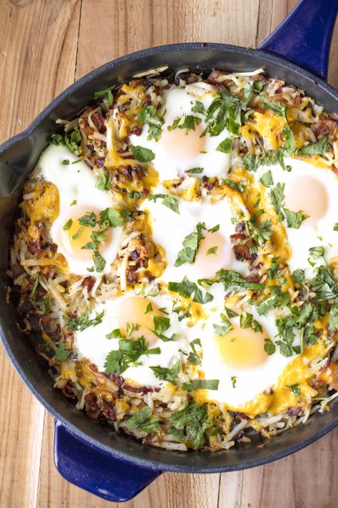 2. Stir in hash browns. Cook, uncovered, over medium heat until bottom is golden brown, about 10 minutes. Turn potatoes. With the back of a spoon, make 8 evenly spaced wells in potato mixture. Break 1 egg into each well. Sprinkle with salt and pepper.